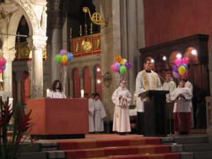 Wir sind eine bunte Truppe zwischen 9 und 25 Jahren mit ca. 50 aktiven Ministranten und freuen uns jederzeit über Neuzugänge – egal wie alt Du bist, ob Du schon woanders ministriert hast oder ganz neu bist.